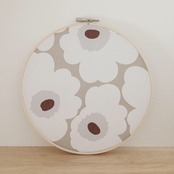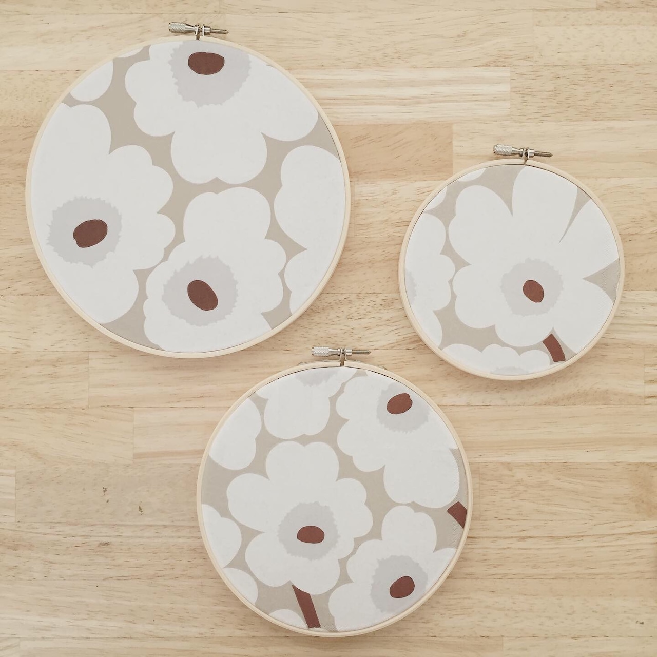 生地をピンと張ってデコパージュを施すと、そのまま壁に飾って楽しめます。